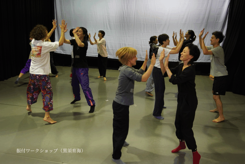 ね。と伝えて下さったり、もっと変にするならどうなるか。と疑問の形でも伝えて下さりました。また、自分の中での面白いにこだわるとそれも育海さんに伝わり、自分にとっての何か面白いという感覚を追求する事も、時に大事だなと思いました。そして、振付家というポジションにおいて、動きの引き出しを増やす為には、言葉の選択や伝えるタイミングもとても大事だなと再認識しました。全体を通して感じたのは、育海さんの身体を動かすWSには、ゲーム性や、リズムに乗って踊ることで、思わず参加者に笑みがこぼれる時間が多くありました。普段創っている中で、創作は、スタッフさんを含めてのチーム作業であると強く感じます。振付家がトップに立つわけではありませんが、振付においては、身体をお借りして、イメージや事象を共有して実験をしていくので、言葉・身体でのやり取りは、空間づくりや関係値、繊細さが求められると思っています。そんな空間を私は現場で築けているのか。と考え直すきっかけにもなりました。。