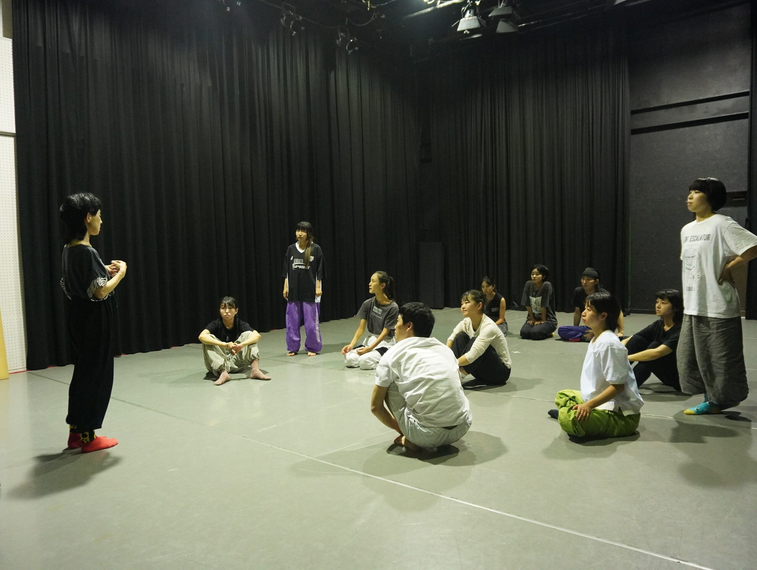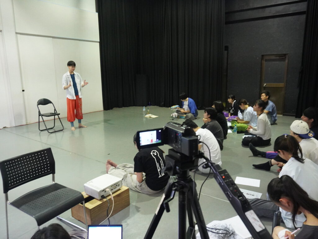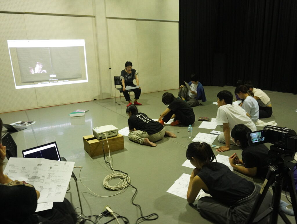東野祥子さんの振付ワークショップでは、まず座学の時間。内容はこれまでの経歴やどんな作品を創作してきたかについて。さらに、舞台作品を作る上で大切なこと、考えなければいけないことなどを、作品映像や当時の資料を見ながら説明していただく、とても貴重な時間となりました…!