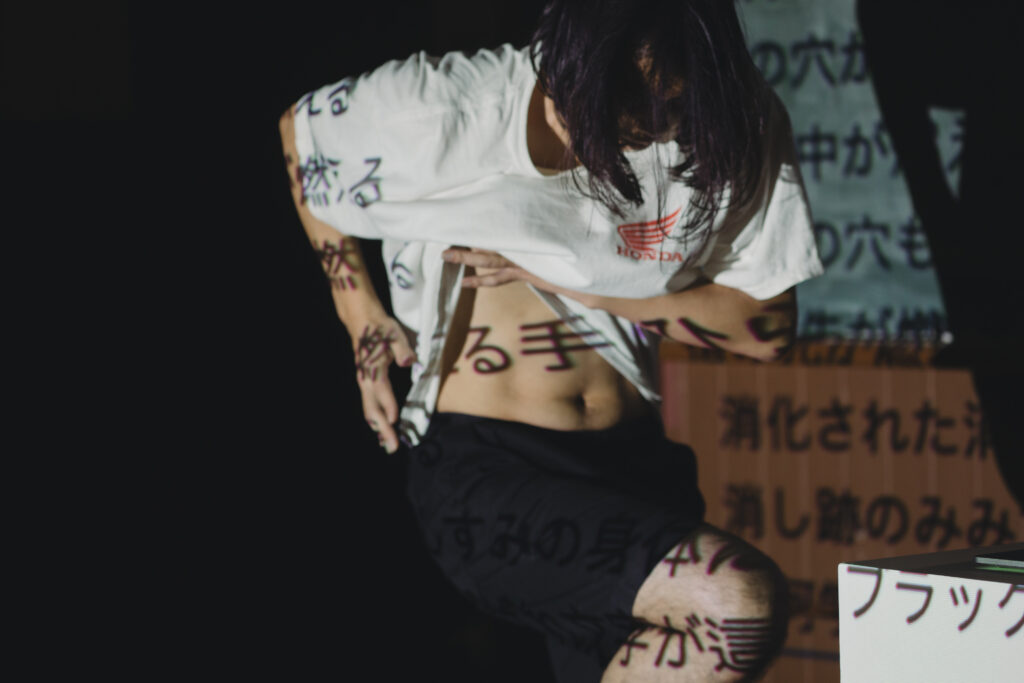 出演者は、言葉をPCに打ち込み、その打ち込む言葉に触発されつつ動く。スクリーンに映し出される言葉は時間の経過とともに集積され、観客の知覚に働きかける詩、あるいは舞踊譜の形をして可視化されてゆく。本作では、言葉が喚起する記憶を身体で「なぞる」ことと、タイピングで「書く」ことが同時に行われる。言葉によって動く方法を批評的に観察しながら、この体験が劇的なものとして知覚され得る空間の創出が本作の関心事である。