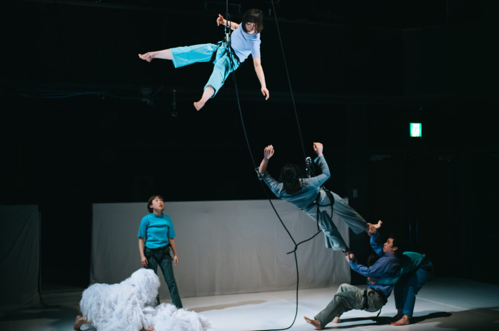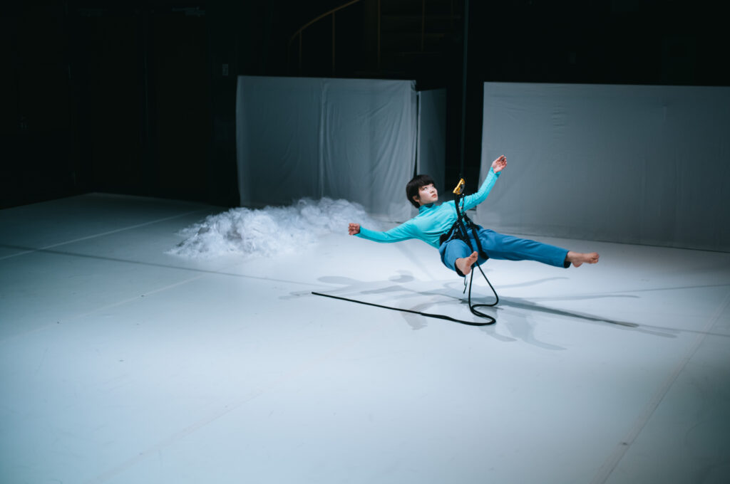 バーティカルダンスというハーネスとロープを装着して踊る空中でのダンス技法を取り入れた作品です。空中に登る為にはロープの設置が必要で、私はしょっちゅう劇場の天井裏や屋上に足を踏み入れます。時には上演中ずっとその暗闇に潜んでいる事も。人が普段は行けない場所に居るってワクワクする。そんな気持ちで空中にダンサーを置く事にハマっています。色々な場所に身体を置きたい。